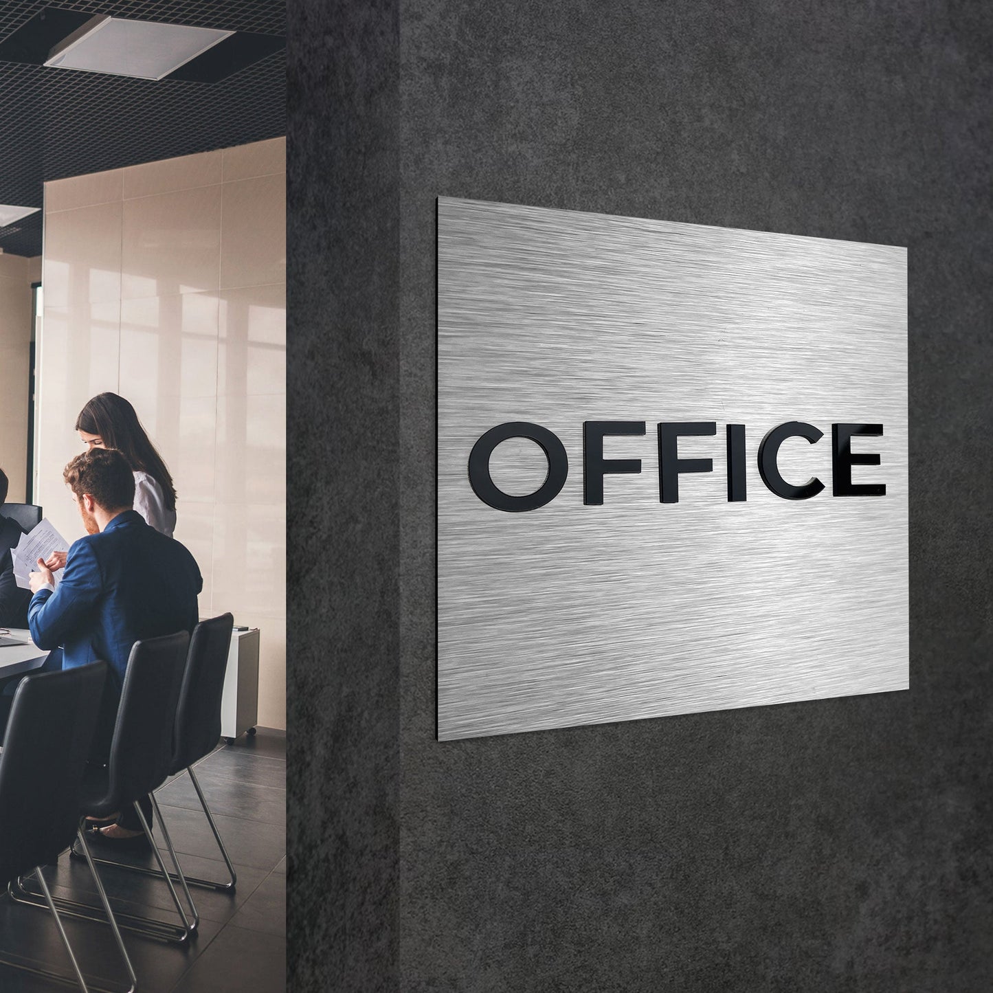 - Konstruktion: Vores kontorskilt har et premium design bestående af to robuste lag. Bundlaget er lavet af børstet sølvfarvet aluminium, som giver både holdbarhed og en moderne æstetik. Det øverste lag består af sort akrylglas, som giver en slående kontrast og forbedrer synlighed.