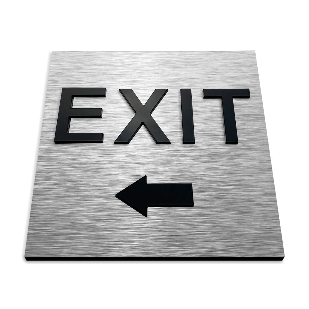- Construction: Our exit sign features a premium design that consists of two sturdy layers. The bottom layer is made of brushed silver aluminum, providing both durability and a modern aesthetic. The top layer is made of black acrylic glass, which provides a striking contrast and improves visibility.
